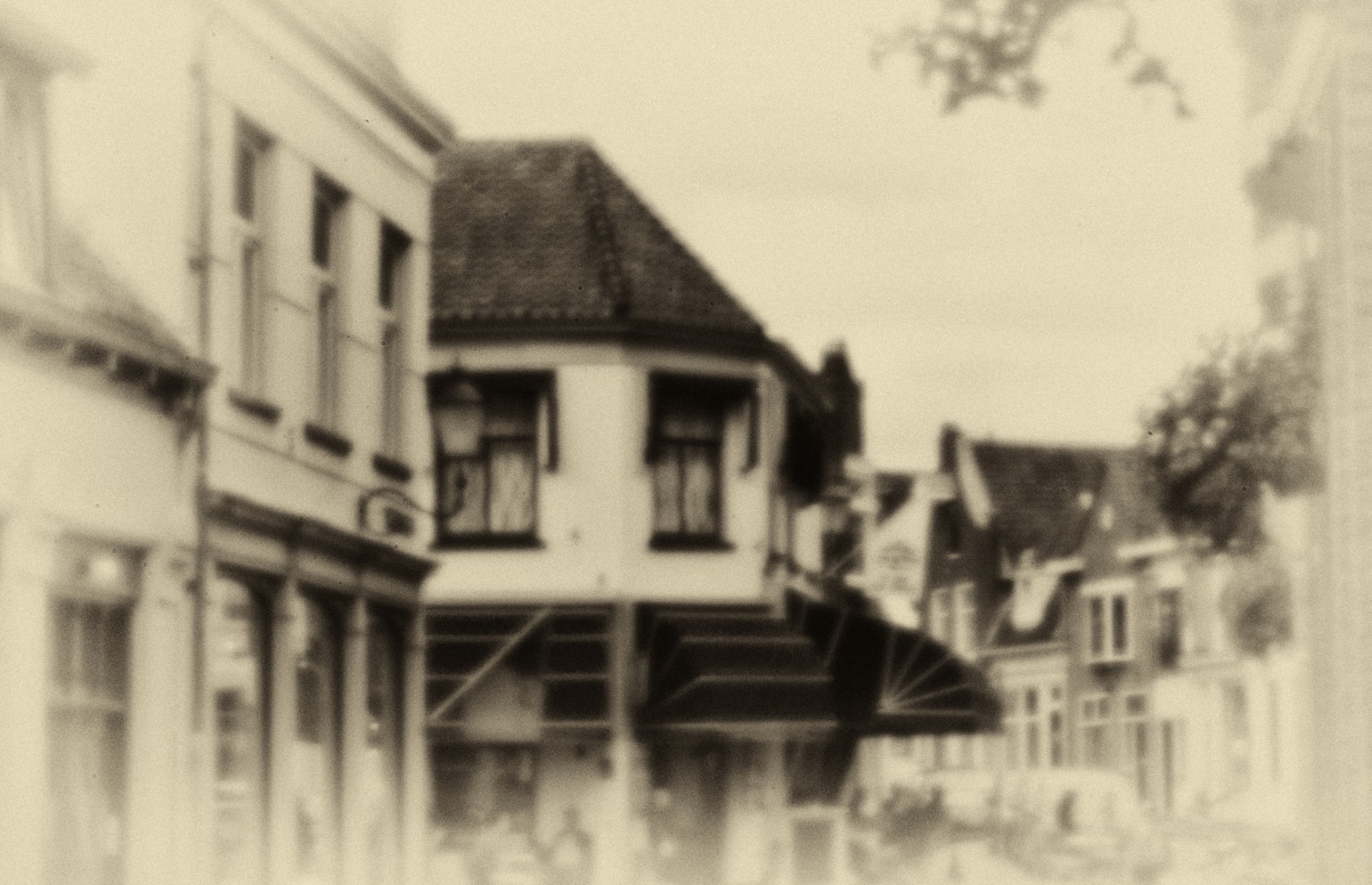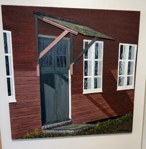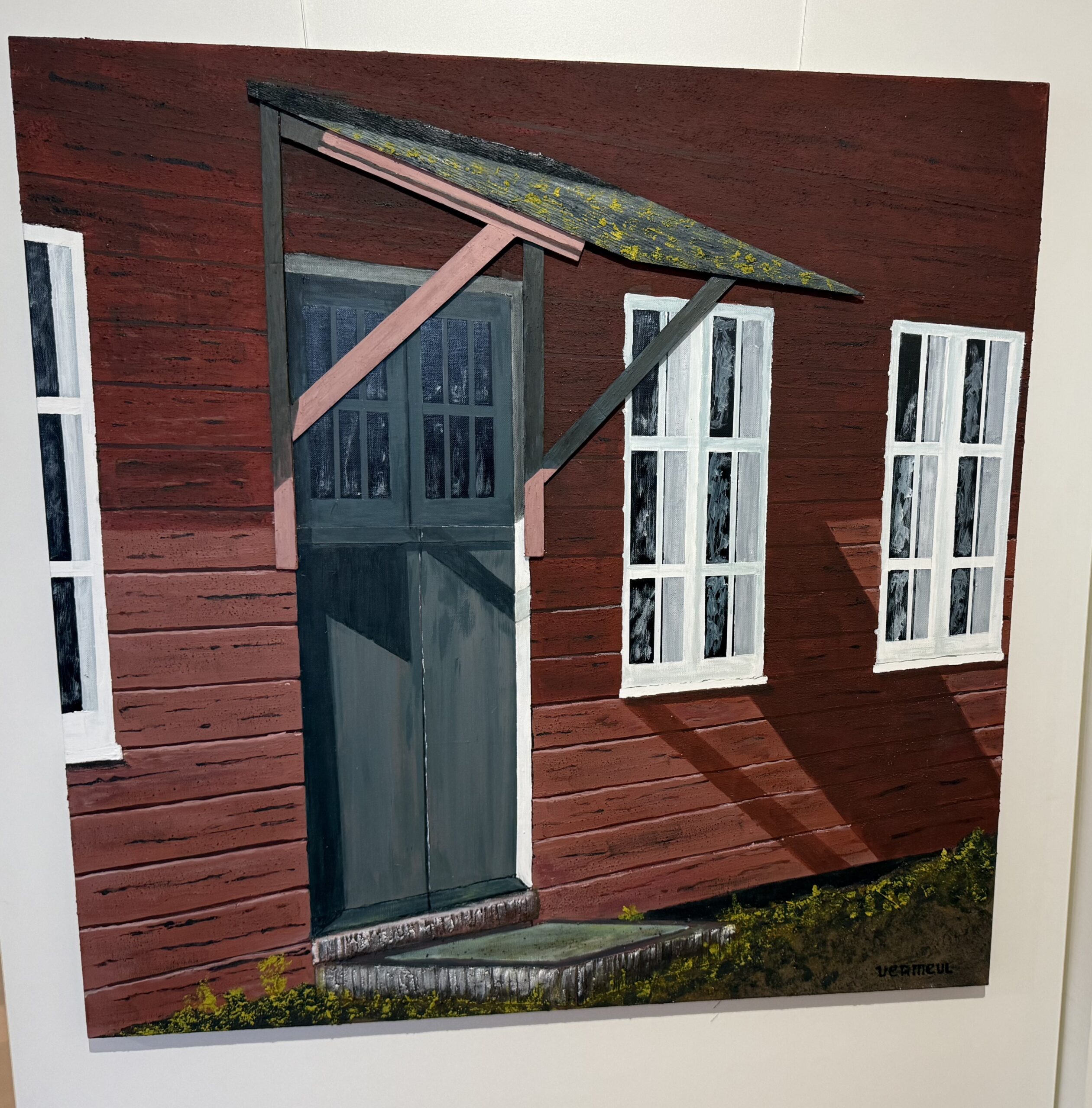 ,,Ik zoom meestal in op een deel van een object. Afgelopen jaar bestond de ‘Historische Kring Leusden’ veertig jaar. Bedacht was om alle kunstenaars uit Leusden en omgeving te vragen een kunstwerk te maken van een historisch complex in Leusden. Ik heb gekozen voor de Leusderheide waar een groep barakken staat. Ik heb voor deze gekozen omdat het zulke mooie, Skandinavische kleuren zijn. Alleen het verhaal erachter is zeer dubbel. Enerzijds is het een kantine, anderzijds is het een opvang geweest van de soldaten die terugkwamen van de Leusderheide en zelfs meegewerkt hebben aan executies. Dat is het sombere van deze barak die ook model heeft gestaan voor de barakken op Kamp Amersfoort.’’
