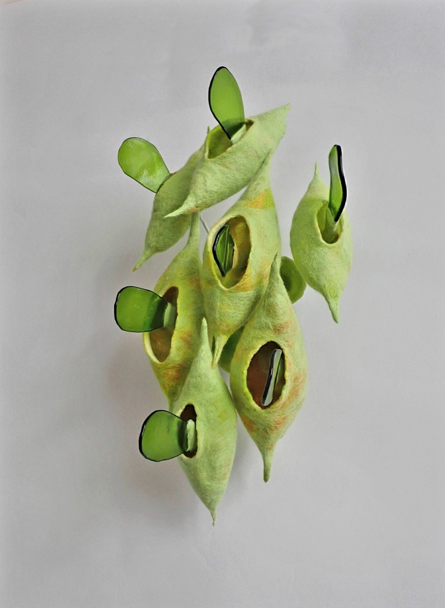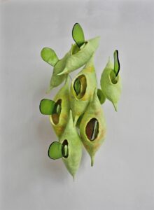 Het bijna twee meter hoge ‘Zeropoint Field’ van Titia Felderhof is bij de entree van de expositieruimte door de afmeting en de gebruikte kleuren nauwelijks te missen. Dat Felderhof uiteindelijk glazenier geworden is, berust in zekere zin op een eerdere teleurstelling. ,,Ik studeerde als fluitiste af aan het conservatorium in Amsterdam. In die tijd gaf ik ook les in dwarsfluit. Maar dat lesgeven vond ik vreselijk. Meisjes die niet studeren en stil blijven staan en ieder jaar terugkomen met hetzelfde deuntje. Dat lesgeven was niets voor mij. In die tijd speelde ik ook in een ensemble, maar toen wij op een dag voor zeven mensen optraden, was het voor mij duidelijk dat ik professioneel niet verder wilde in de muziek; ik wilde meer met mijn handen werken. Dat ik uiteindelijk glazenier geworden ben, heb ik van huis uit meegekregen. Twee van mijn grootouders verzamelden glazen kunst en graveerden ook glazen voorwerpen; dat heb ik van hen geleerd. Mijn moeder was ook glazenier, dus van vreemden heb ik mijn huidige vak niet. Mijn opleiding heb ik in eerste instantie bij Ron de Boer in Baarn gevolgd. Daarna volgde een Master-glassopleiding bij Sibylle Gielen in Tilburg. Mijn specialisatie is brandschilderen. Tegenwoordig werk ik als glazenier op basis van opdrachten en restaureer ik glas in lood.”