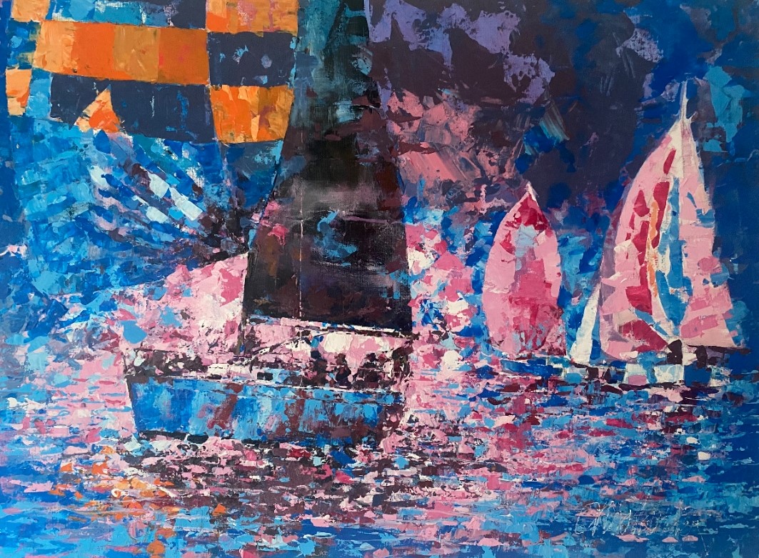 Dat Ad Noorlander zijn inspiratie vooral in de zeilsport opdoet en graag op een impressionistische manier schildert, komt tot uiting in ‘Voor de Wind’. Sinds de jaren ’70 van de vorige eeuw is zeilen zijn passie; schilderen doet hij sinds tien jaar. ,,Zeilen is niet alleen mijn passie, het is ook mijn inspiratiebron. Wat ik op het water beleef, sla ik op en vertaal het naar het doek. Details vind ik daarbij niet belangrijk.”