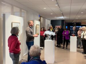 Voor de opening van de jaarlijkse groepsexpositie van ‘De Kunstberg’ was Co Meerveld, lijsttrekker CDA gevraagd. Dat had hem niet alleen verrast, hij was er vooral ook heel blij mee. ,,Ons land is gezegend met veel mooie musea en daar kom ik graag. Ik ben zeker geen kunstkenner, maar wel een kunstliefhebber. Daarom vind ik het fantastisch om hier vanmiddag te zijn. Kunst verheft ons uit de dagelijkse sleur en de ellende die wij om ons heen zien. Wat wij in musea zien, verandert ons perspectief”, aldus Meerveld. De expositie geeft een goed beeld van de diversiteit aan stijlen en voorkeuren die de leden van De Kunstberg kenmerken.