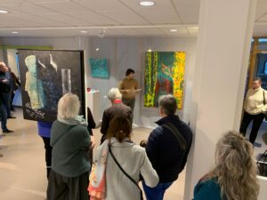De deelnemende kunstenaressen lichten hun werken toe aan geïnteresseerden, waaronder de wethouder natuurlijk.